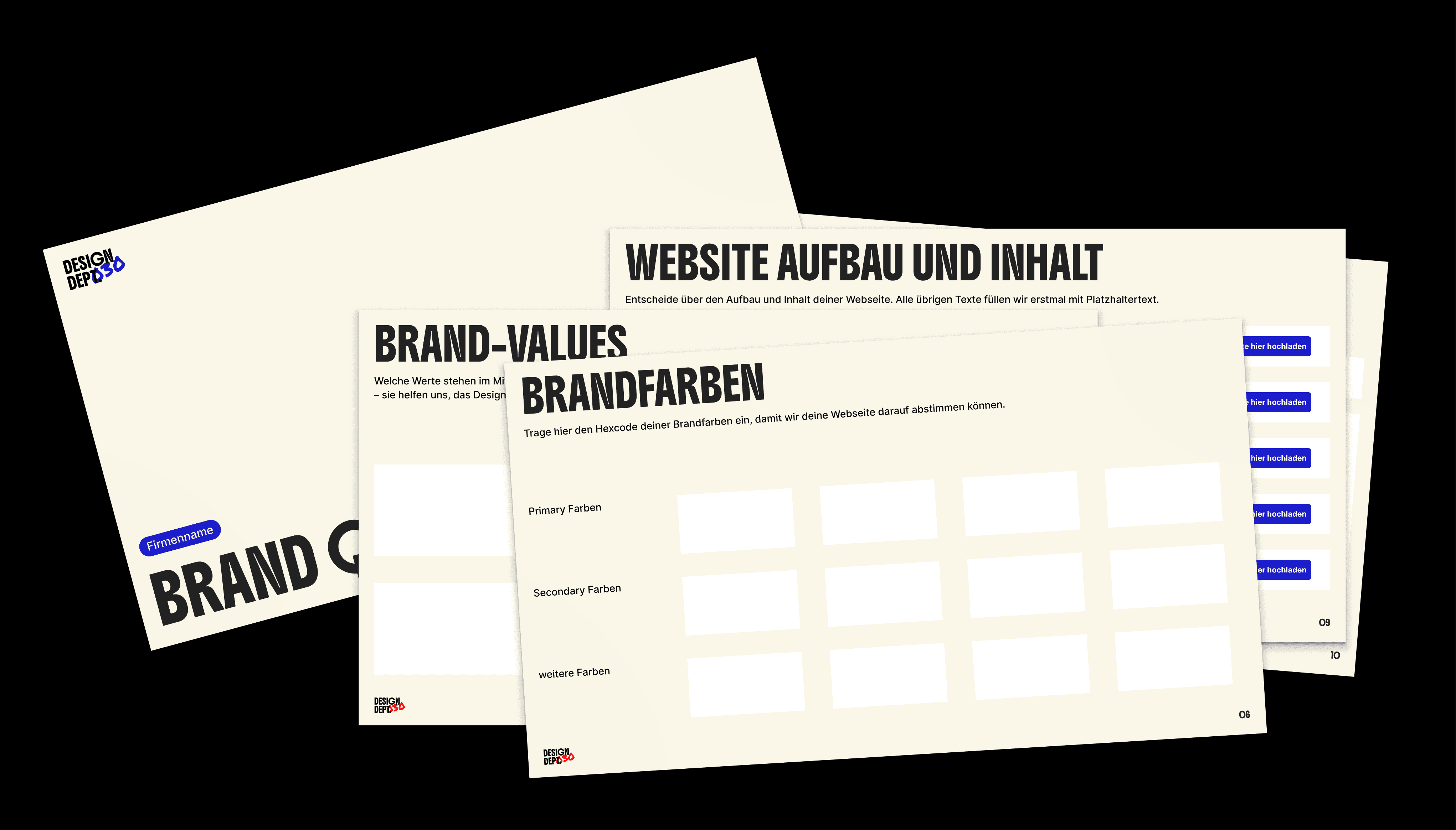 Nach deiner Entscheidung für eine Zusammenarbeit erhältst du von uns einen einfachen Upload-Link. Dort kannst du all deine Brand-Assets, Texte, Fotos und weiteren Materialien gebündelt einreichen. Dieses Material-Kit bildet die Basis für den gesamten Designprozess.